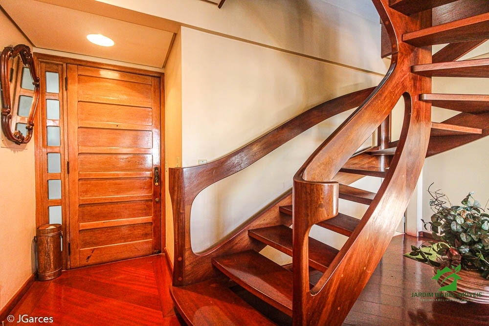 Uma linda escada de madeira de lei conecta os dois andares, adicionando um toque de elegância à sua casa.